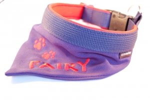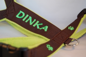 Auf Wunsch kann das Geschirr mit Ihrem Wunschtext bestickt werden (Name auf dem Rückensteg, Telefonnummer auf dem Bauchsteg, Pfoten etc.)